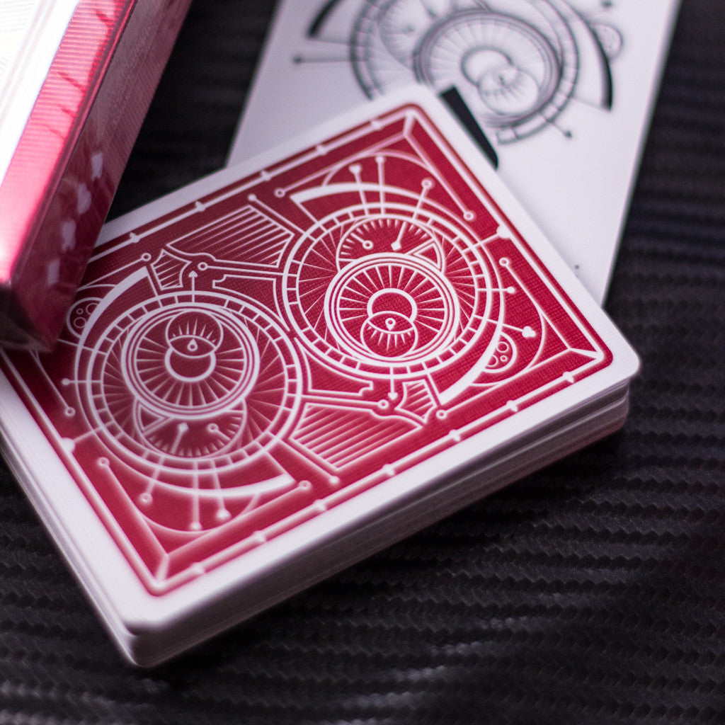 Celestial was inspired by the astronomical instruments of ancient times, the charts of the sky and the limitless bounds of imagination. Featuring a rich red back with a purposefully simple and bold design, Celestial incorporates dynamic edge detail that looks amazing in fans, while the stark white design lines catch the eye and are perfect for cardistry. Like all Encarded decks, the faces are custom yet familiar and perfectly playable.