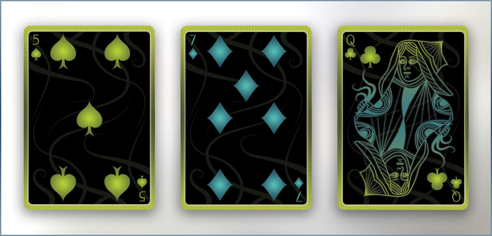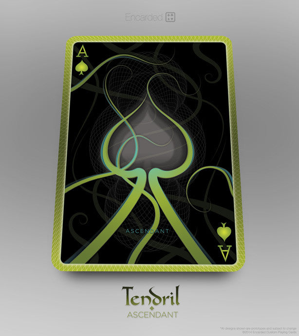 Tendril: Ascendant playing cards incorporate all the refinements that we have learned over the years and mixes those with the organic symmetry first seen in Tendril. The colors are bold, the borders are intense, the faces are dark and the level of detail has been increased.