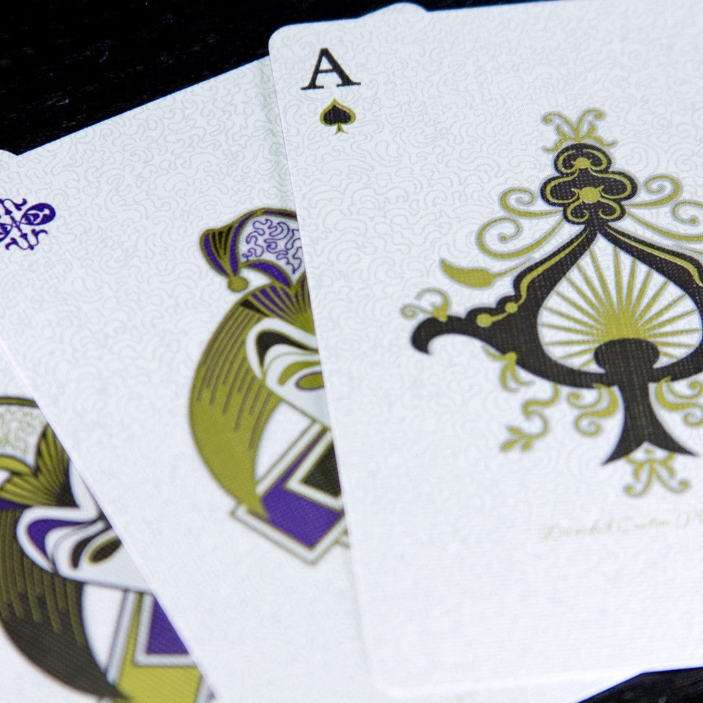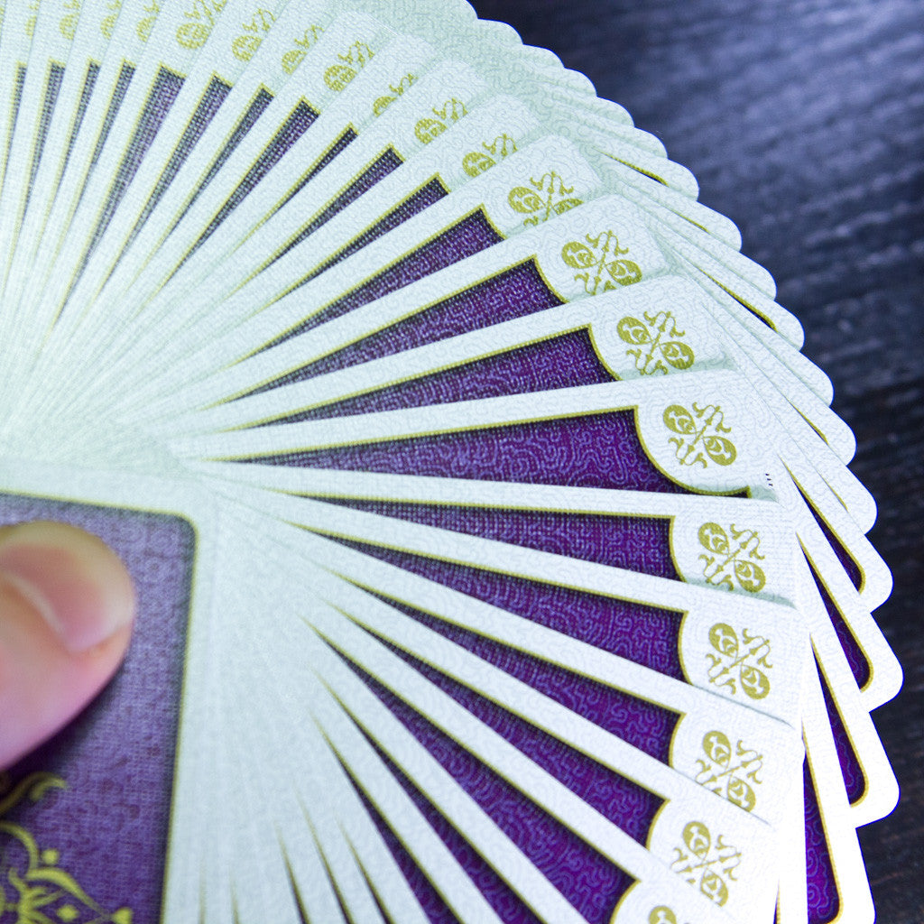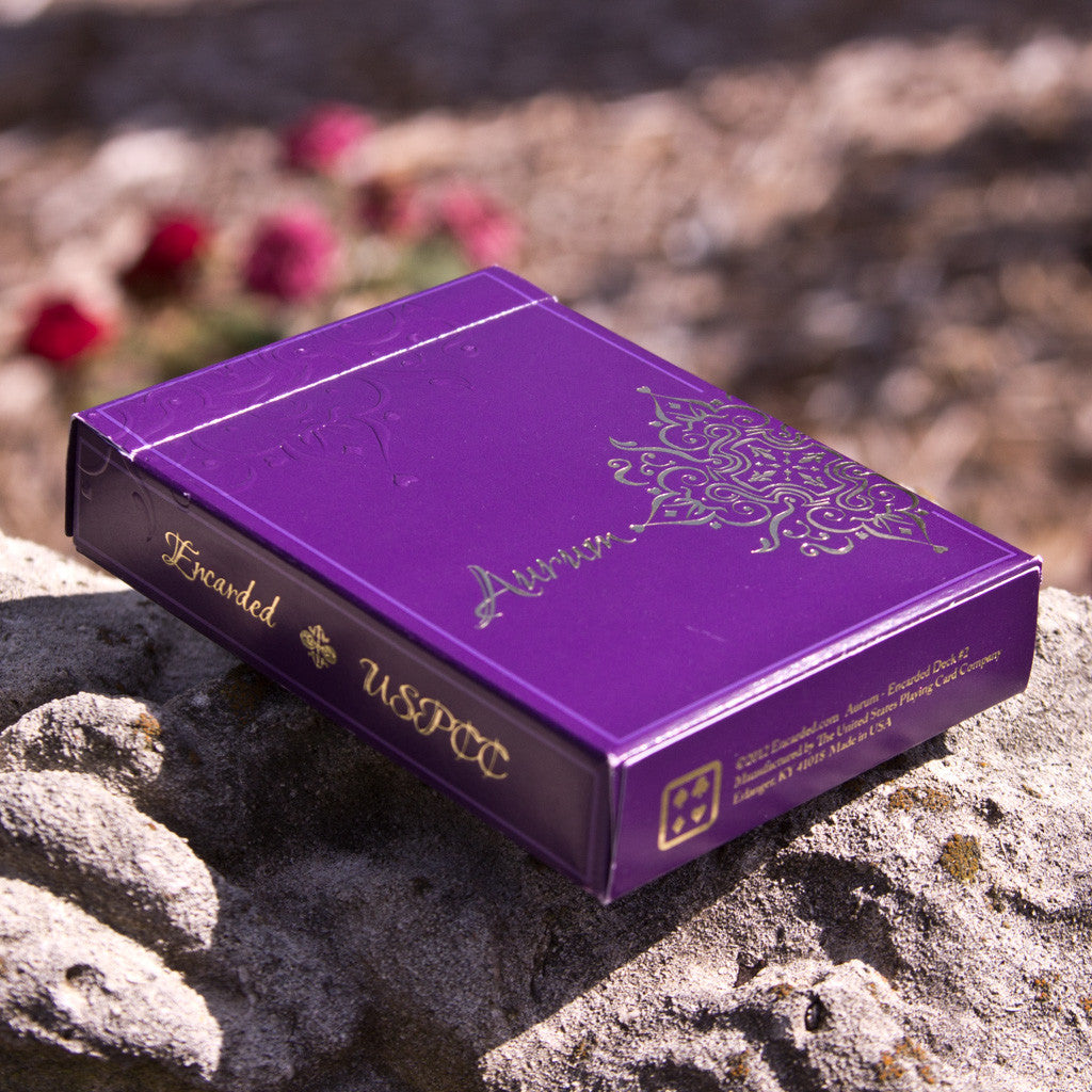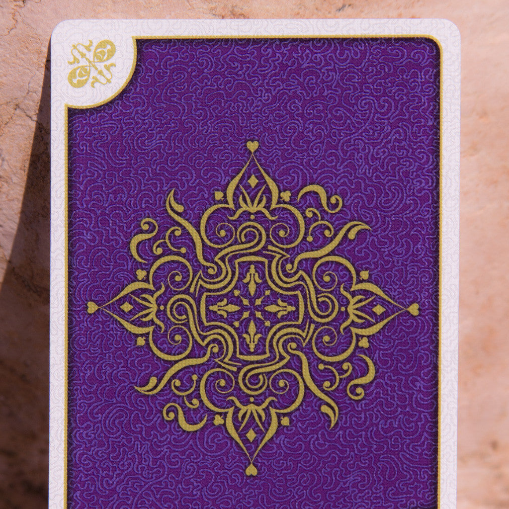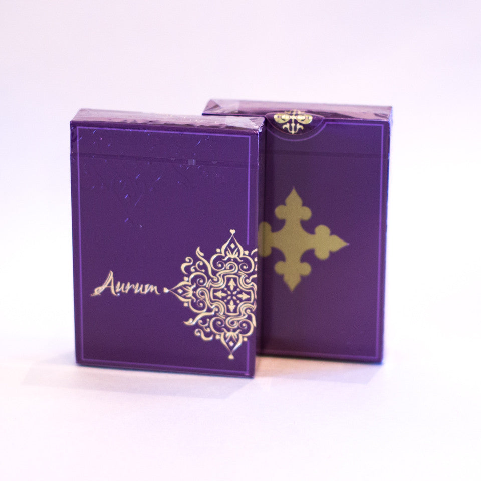 This is the purple "Sovereign" edition of Aurum. 4,500 of these decks were made. The sumptuous royal purple tuck box features incredibly intricate gold foiling, metallic inks and embossing as well as a custom diecut that allows you a glimpse inside to the special gold ad card within. Every card is intricately designed and features multiple metallic inks and was also carefully crafted to be "purposefully imperfect."
